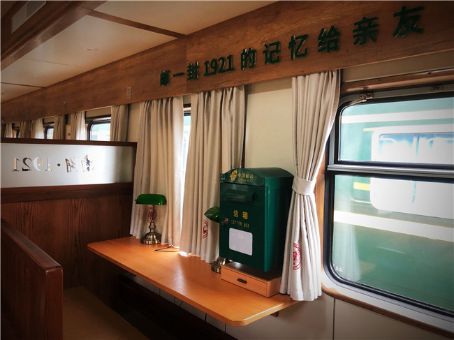 其中有2节改造成红色主题车厢,部分内饰还原到20世纪20年代,1号车厢设立“历史的记忆·火车邮局区”,可以购买主题明信片并邮寄;2号车厢设立“红色阅读教育·火车学习角”,存书约130余册,可以借阅红色书籍重塑梦想。