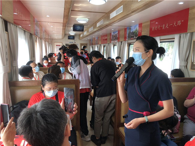 红色旅游列车不仅串联起“开天辟地 革命启航”上海市中共一大至嘉兴南湖这条精品线路。其主题功能车厢内还安排了车载宣传片观看、专业讲师讲授模拟实景党课、革命歌曲演唱、党史知识竞答等丰富的互动活动环节,真正将铁路交通与文化旅游创新融合起来,在铁轨上“画”了一道文旅融合的风景线,为文旅高质量发展提供了更广阔的思路。列车常态化开行的运行方式及新颖的文旅融合模式必将推动红色旅游的新发展。