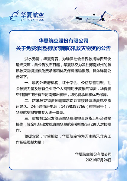 据华夏航空消息,为确保社会各界救援物资尽快运抵灾区,7月24日起,华夏航空为发往河南郑州的防汛救灾物资提供免费承运和优先保障运输服务。