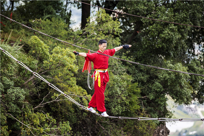 在翠峦环匝的东西峰窦真殿与东岳殿之间,海拔1100米的突兀三峰自山顶壁立,高垒深堑,距地面相对高度51米,空距30多米,其间以两条悬空铁索相连,铁索上表演的人,行走如风,被誉为“华夏一绝”,2018年被列为省级非物资文化遗产。