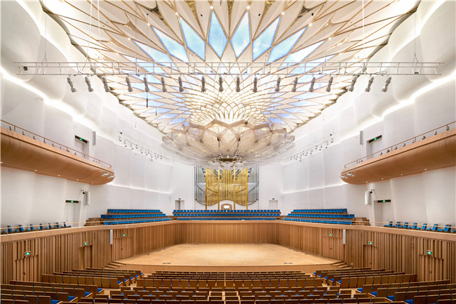 素雅晶莹的音乐厅,以九寨蓝为主色调,烘托出了浓郁的四川元素。音乐厅穹顶以成都市花芙蓉为设计元素,以水晶质感的材料予以表现,既有大气庄重的时代感,又突出了浓郁的成都味儿。在功能上,这个由亚克力材质制作出的重达26吨的“返音板”,能让观众在厅内每个方位都能享受最优质的听觉体验。音乐厅舞台的正上方是一台来自德国管风琴制造世家克莱斯品牌为音乐厅量身定制的管风琴,它既能演奏宏大的乐曲,也能展现小桥流水般的温柔之声。