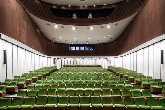 相比辉煌大气的歌剧厅,以深咖色为主基调的戏剧厅更专注于服务专业传统戏剧及话剧演出,搭配墨绿色的座椅和蜀锦暗纹的墙面,将成都的特色文化融入其中,以含蓄的方式展现出成都悠久的文化积淀。