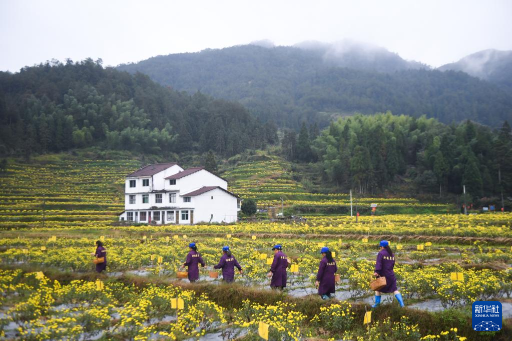 11月4日,在浙江省青田县阜山乡轩德皇菊基地,工作人员去采摘皇菊。 11月初,浙江省青田县阜山乡的千亩皇菊基地进入收获期,吸引游人慕名前来。近年来,浙江省青田县阜山乡依托盆地和梯田种植了1200亩皇菊,年产值3000余万元,吸纳了当地100余名村民就业。村民不仅能得到土地租金分红,还能直接在家门口就业,每年仅村民劳务等费用发放就超过200多万元。当地皇菊产业已经成了青田农旅融合发展、产业兴旺发展的一张金名片。 新华社记者 徐昱 摄pagebreak