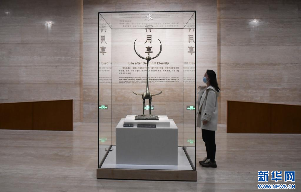 12月20日,参观者在观看铜鹿角立鹤。