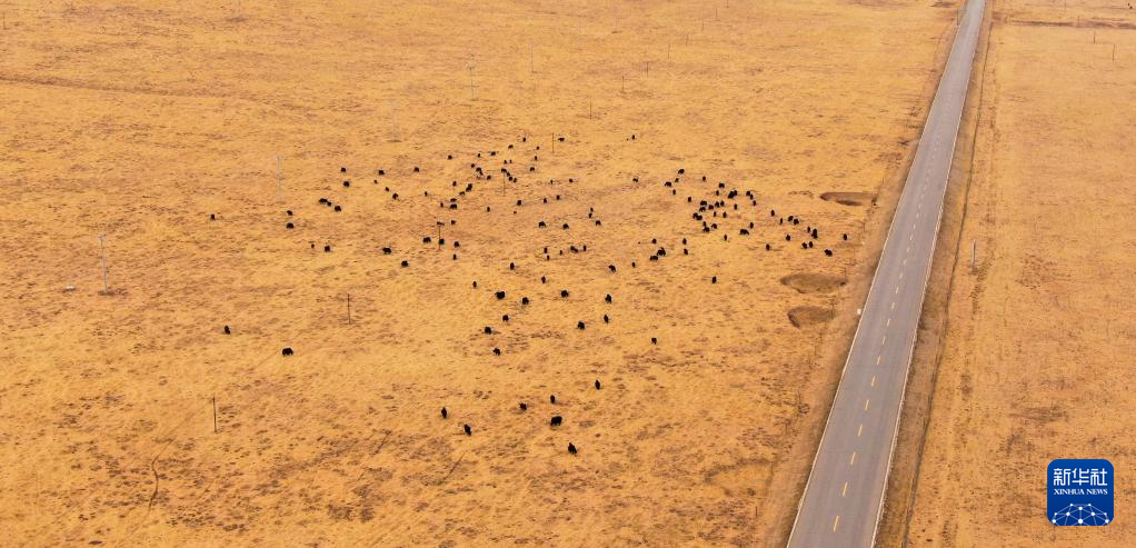 3月31日,在青海省黄南藏族自治州河南蒙古族自治县,一群牦牛在草原上吃草(无人机照片)。