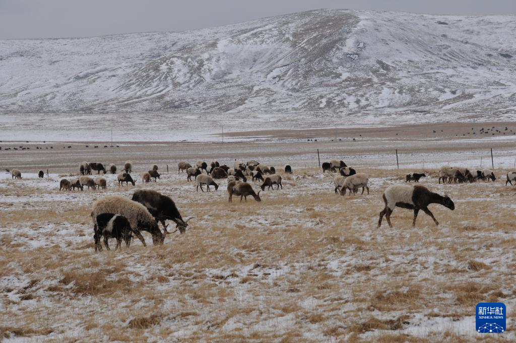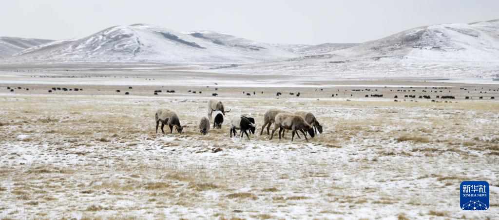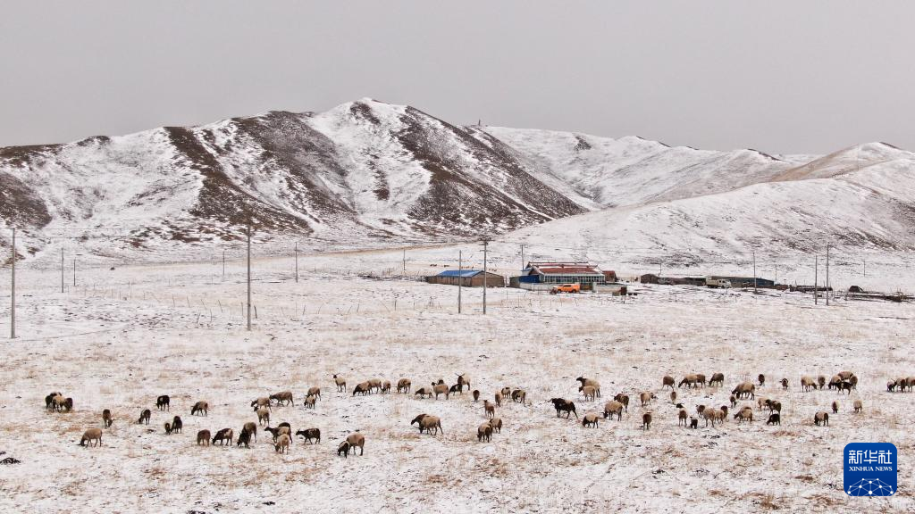 3月31日,青海省黄南藏族自治州河南蒙古族自治县,一群欧拉羊在雪后的草原上吃草。