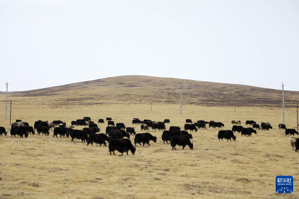 3月31日,青海省黄南藏族自治州河南蒙古族自治县,一群牦牛在草原上吃草。