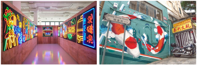 西九龙文化区艺术展览(左)、荷里活道中式锦鲤壁画(右)