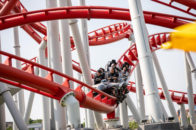 《鹰击长空》是一款弹射式过山车项目,通过时速高达92公里的瞬间加速、16种高度模拟舰载机的翻滚动作,一开园就吸引了大量年轻游客冲向排队区。