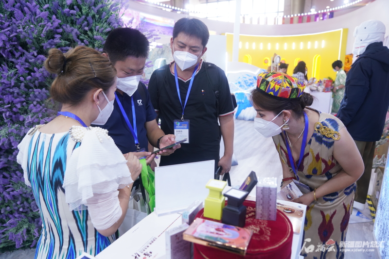 参观者在新疆展馆咨询。石榴云/新疆日报记者张万德摄