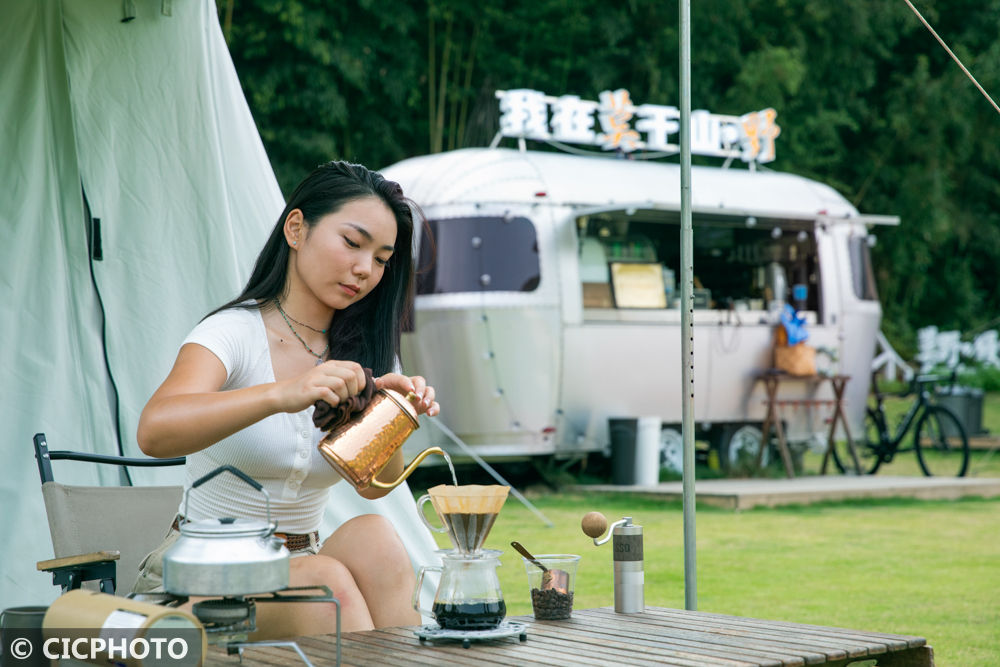 ↑2022年7月15日,在浙江省湖州市德清县的莫干山露营地,旅者手冲咖啡,香气四溢。CICPHOTO/高明 摄