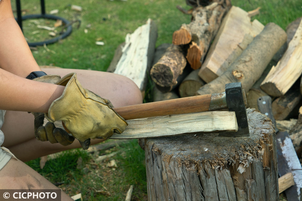 ↑2022年7月15日,在浙江省湖州市德清县的莫干山露营地,旅者体验劈柴。CICPHOTO/高明 摄