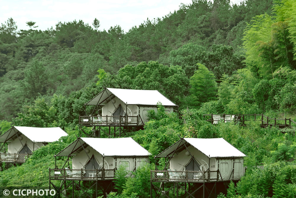 ↑在浙江省湖州市德清县,随着旅游业发展,周边涌现出一批户外旅游项目。图为2022年7月15日,上渚山奇幻谷茶野里野奢帐篷营地,宽敞的露台可以眺望茶园。CICPHOTO/高明 摄