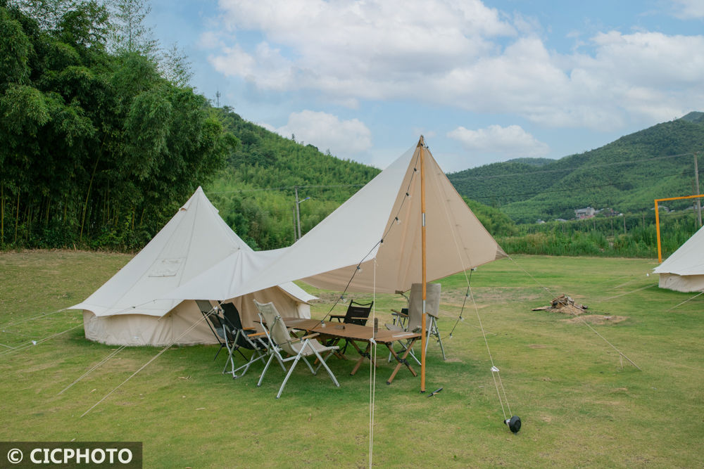 ↑2022年7月15日,在浙江省湖州市德清县的莫干山露营地,草地上搭起帐篷。CICPHOTO/高明 摄