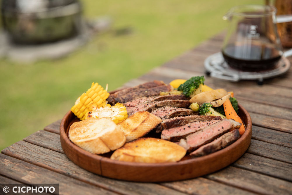 ↑2022年7月15日,在浙江省湖州市德清县的莫干山露营地,旅者野炊时煎出的牛排。CICPHOTO/高明 摄