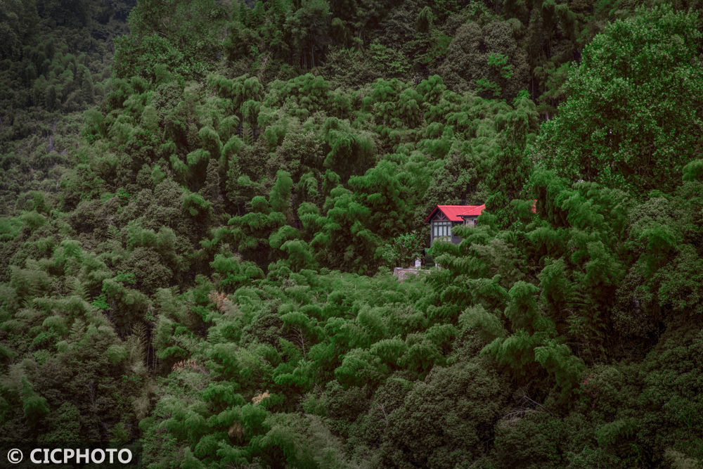 ↑2022年7月15日,浙江省湖州市德清县,绿树环抱的山间小屋。CICPHOTO/高明 摄