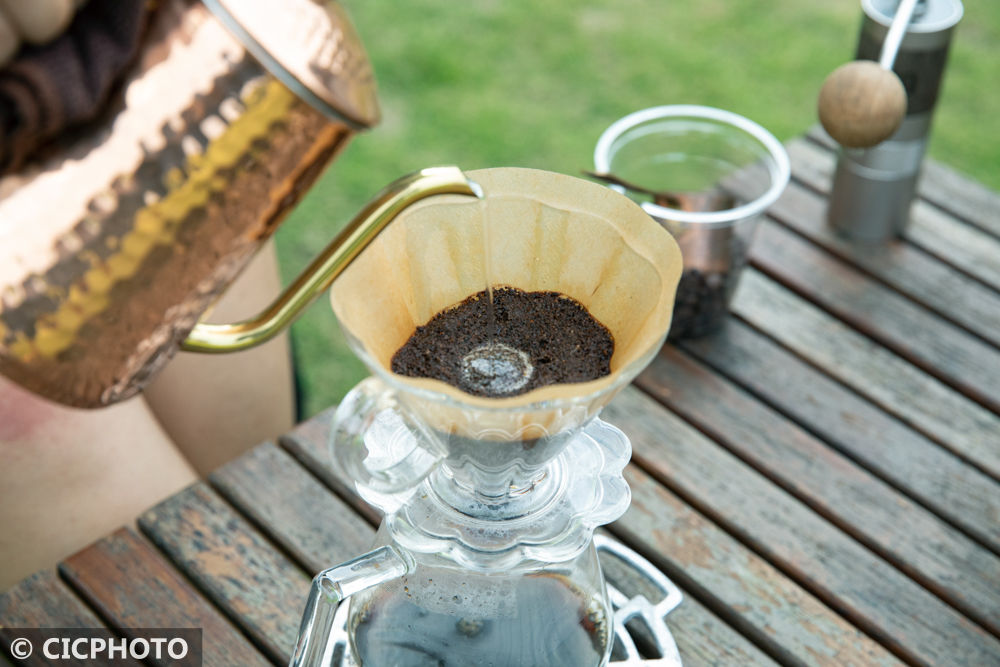 ↑2022年7月15日,在浙江省湖州市德清县的莫干山露营地,手冲咖啡香气四溢。CICPHOTO/高明 摄