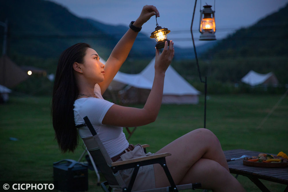 ↑2022年7月15日,在浙江省湖州市德清县的莫干山露营地,旅者在傍晚时分点亮风灯。CICPHOTO/高明 摄