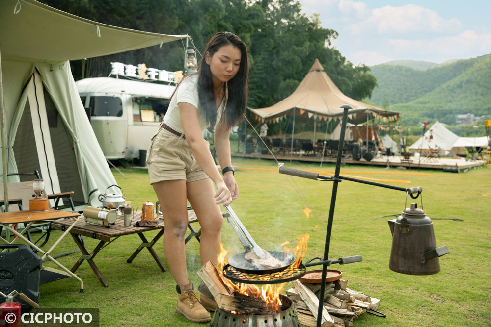 ↑2022年7月15日,在浙江省湖州市德清县的莫干山露营地,旅者用铁锅煎牛排。CICPHOTO/高明 摄