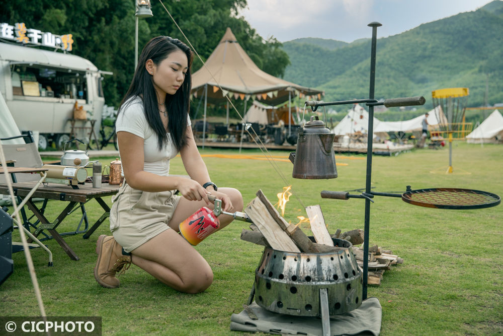 ↑2022年7月15日,在浙江省湖州市德清县的莫干山露营地,旅者点燃炉火。CICPHOTO/高明 摄