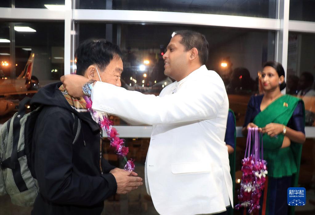 斯里兰卡旅游部长费尔南多和中国驻斯大使戚振宏等为刚下飞机的中国游客戴上欢迎花环。费尔南多说,很高兴前来迎接首批中国旅行团,期待更多中国游客到访,从而提振斯里兰卡旅游业乃至整体经济。