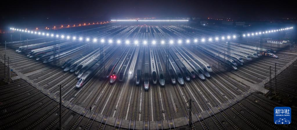 动车组列车停靠在武汉动车段的存车线上(1月7日摄,无人机拼接照片) 新华社记者 伍志尊 摄
