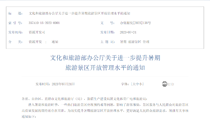 通知中称,进入暑期和旅游旺季,一些热门旅游景区出现预约难等问题,影响了游客体验,景区服务与人民群众对旅游景区高质量发展的期待还存在差距。为切实提升暑期旅游景区开放管理水平,更好满足人民群众旅游需求,现就有关事项通知如下: