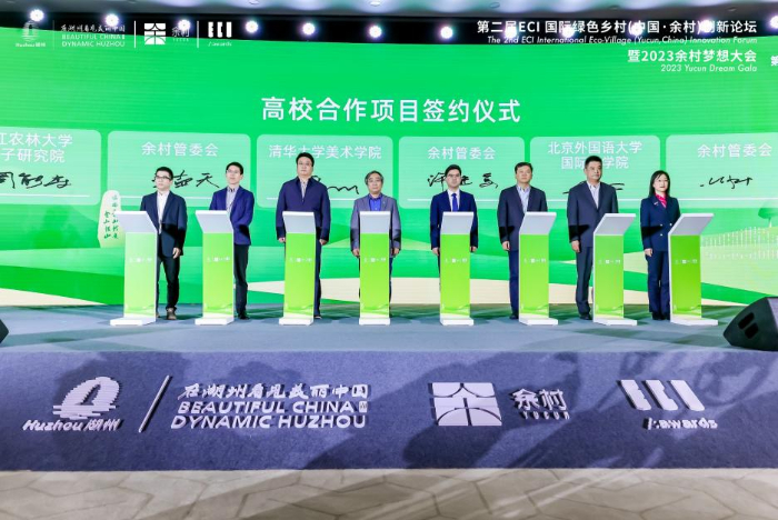 大会上,大余村与清华大学美术学院、北京外国语大学国际商学院、浙江农林大学竹子研究院、湖州学院设计学院完成签约合作,将高校人才培养与乡村人才振兴进行耦合。清华大学美术学院将在大余村共建清华大学美育工作站(安吉站)及新生活艺术馆,共同举办“安吉山川艺术季”和“国际青年艺术家论坛”,以大余村为据点重塑乡村美学。北京外国语大学国际商学院将建立“长三角代表处”和“留学生实习实践基地”,携手大余村为乡村振兴输送国际人才,助力国际品牌推广。湖州学院设计学院围绕“绿色设计”赋能大余村发展和乡村振兴,计划形成“理论一起学,活动一起做,阵地一起建,难题一起解”的“四个一”共建体系。浙江农林大学竹子研究院将助力上墅乡刘家塘村创建“中国竹文旅第一村”,共建竹子研究院博士工作站和研究生联合培养基地,着力推动自然教育和竹产业相关培训事业。
