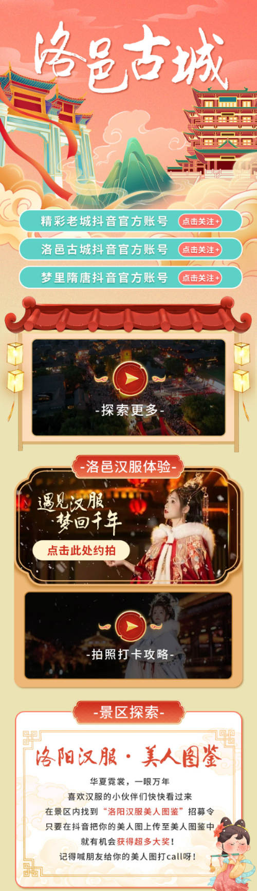 由新华网、洛阳市老城区宣传部、洛邑古城景区联合发起的活动首站上,游客扫描落地页二维码,不仅可实现免费入园,还可一键关注“精彩老城”“洛邑古城”和“梦里隋唐”三大抖音账号,形成一个完整的品牌矩阵,提升新媒体平台的用户粘性。