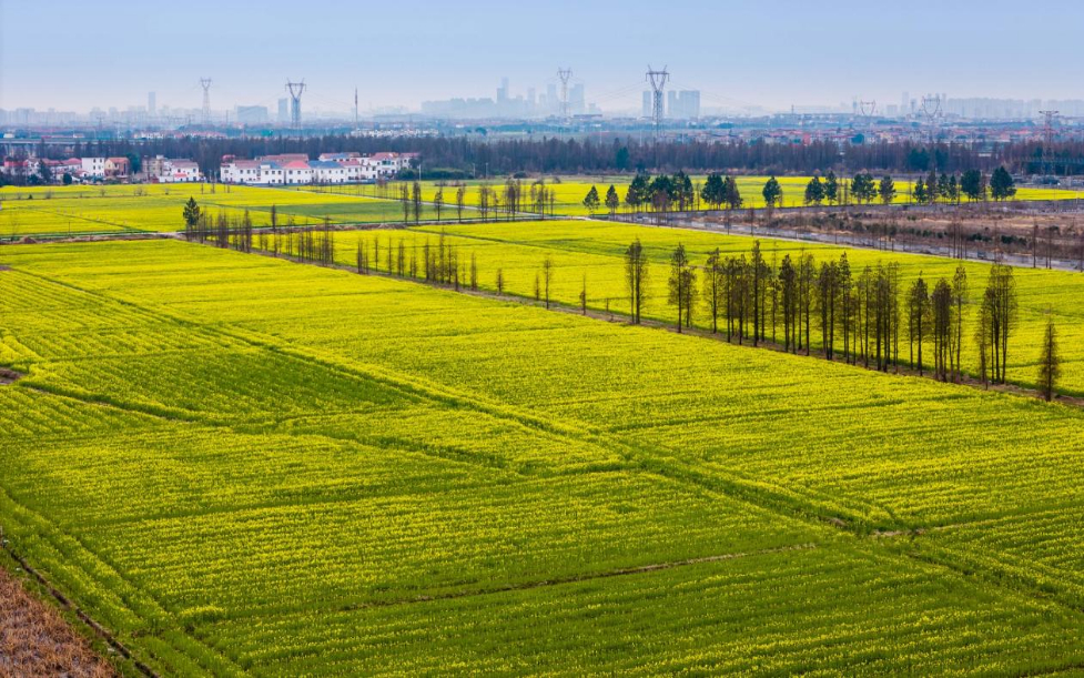 在南昌县南新乡、塔城乡、银三角原城纪、广福镇木山村、蒋巷镇等九个地区油菜景点花期正盛,万亩金花烂漫春色,与周边村落相得益彰。(叶炼青)