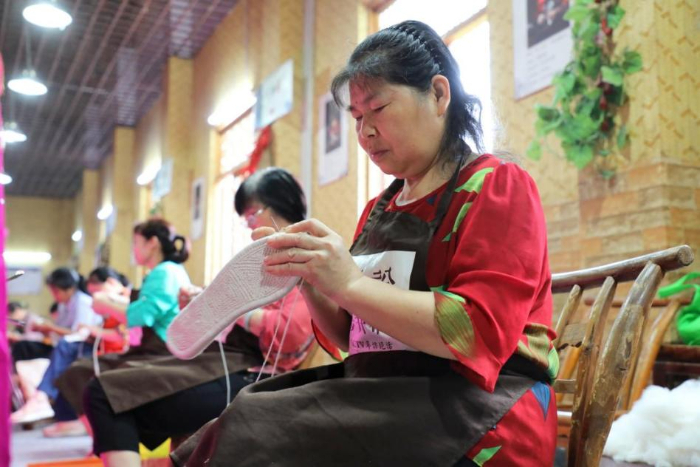 传承人群在枝江布鞋非遗工坊制作布鞋。