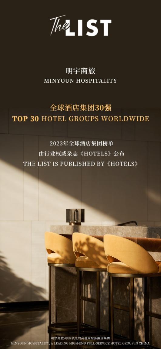 7月22日,行业权威杂志《HOTELS》发布2023年全球酒店榜单,明宇商旅连续两年强势入榜全球酒店集团三十强。在入围的221家酒店集团中,中国本土酒店管理集团入围19家,明宇商旅位列第10位,高端民营酒店集团第2位。