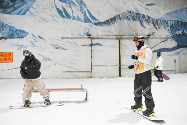 6月18日,在位于重庆的一家室内滑雪场,滑雪教练(中)在对学员进行指导。新华社记者 王全超 摄