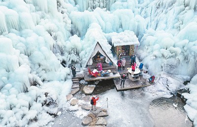 游客在山东济南九如山风景区欣赏冰瀑景观。
