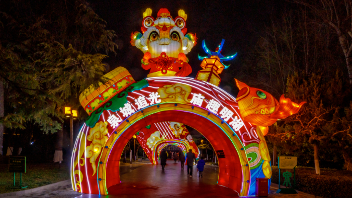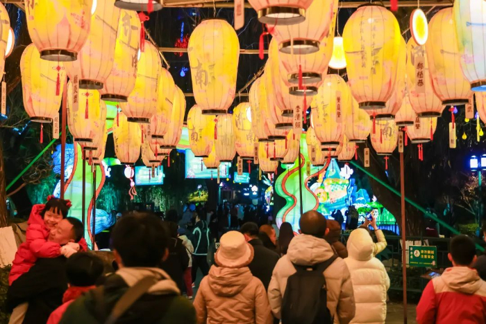 五龙潭景区在春节期间变成了诗意梦幻世界。花灯绽放,满园繁星点点、灯光摇曳、色彩缤纷,“林深见鹿”“诗情画意”,草木中花开绚烂,树枝上蝶舞翩跹,一组组花灯营造出幸福静谧的烂漫时空,让五龙潭焕然一新,成为新晋热门打卡地。