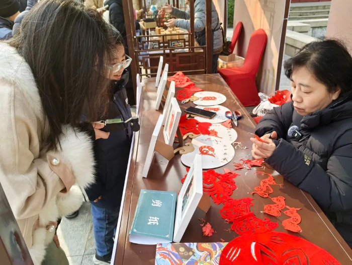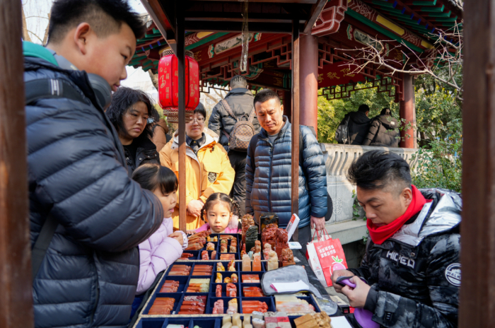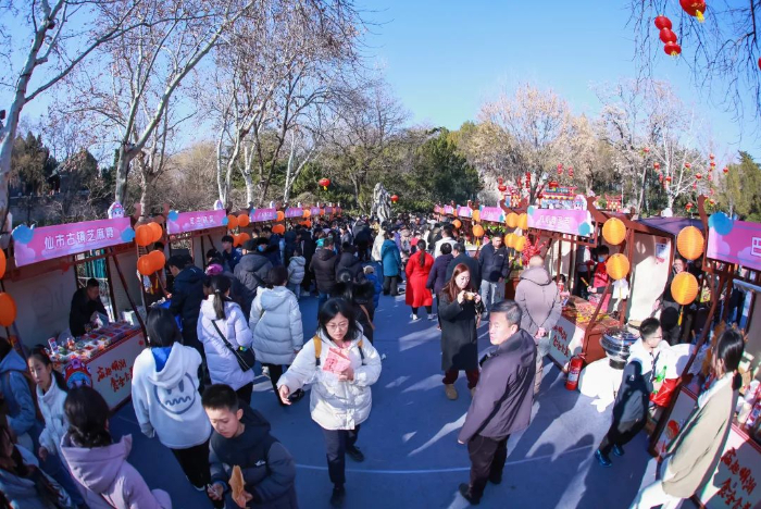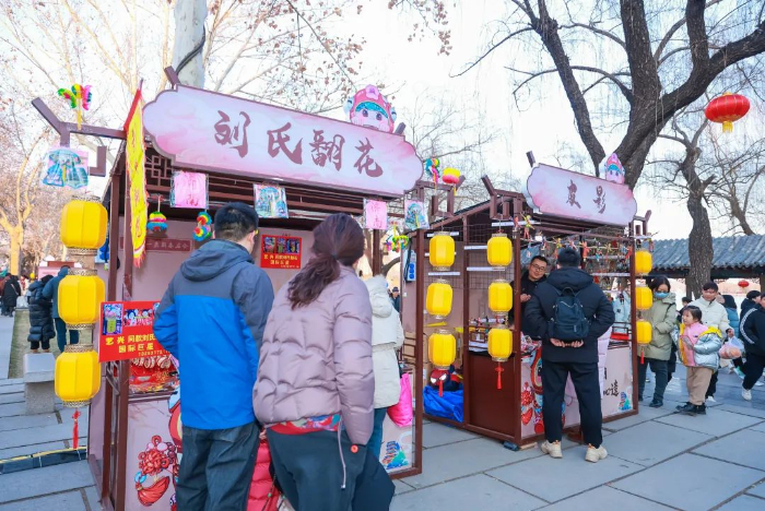 五龙潭公园结合传统的秦琼祈福文化活动,在青泉广场和玉泉广场设置非遗文创市集,春节期间氛围热烈,年味浓郁。面塑、剪纸、皮影、草木香囊、木版年画等非遗好物汇聚一堂,精美的手工艺制作令现场游客惊叹不已,眼界大开。