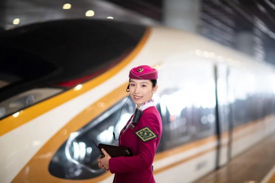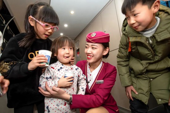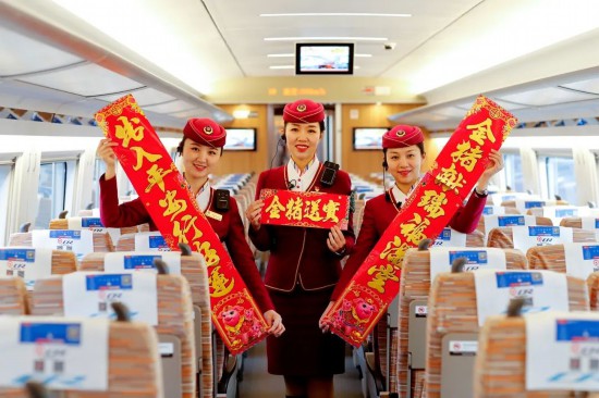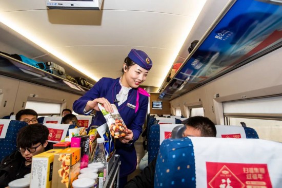 除夕当天,复兴号上的乘务员送出祝福。