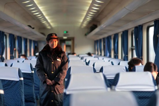 1月22日,K5209次列车上,新入路的“00后”乘务员在车厢内巡视。