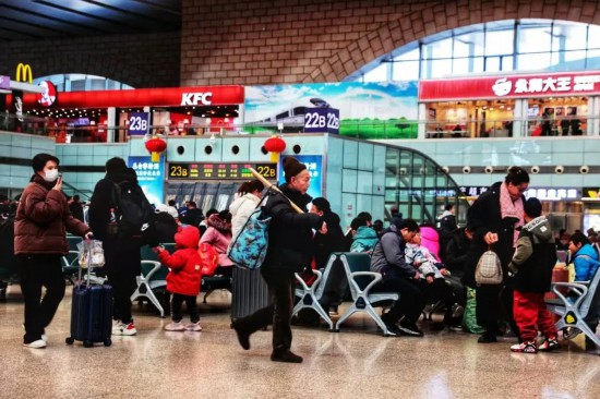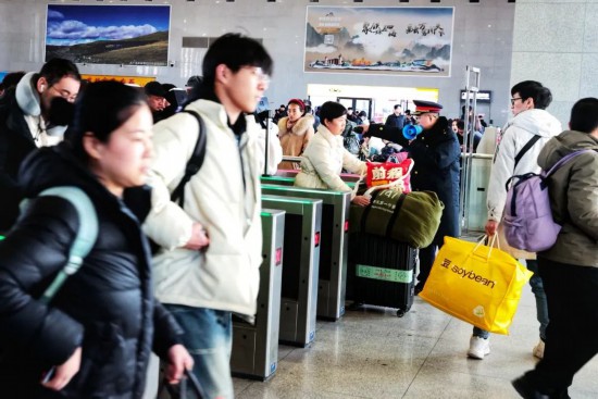 2月5日迎来返程高峰,邯郸站内的旅客依次检票进站。