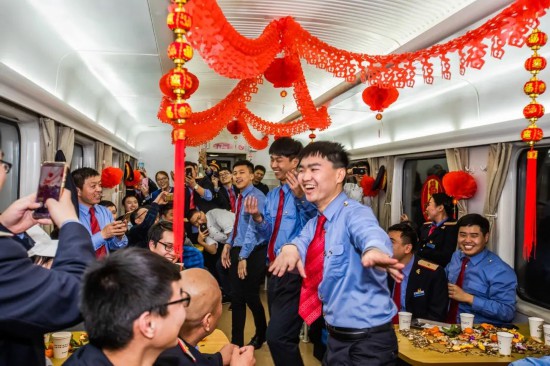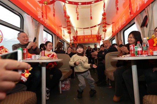 2月4日,临客列车上的客运员与旅客一起联欢。