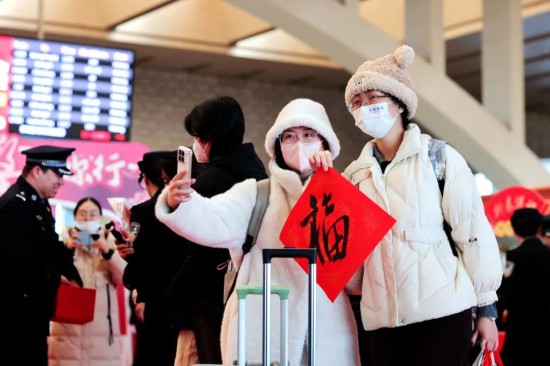 2025年铁路春运“万福迎春”活动现场,一位外籍旅客自拍留念。