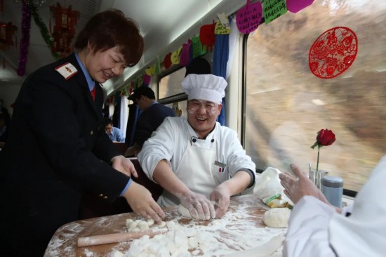 2013年除夕,北京西开往成都的列车上,铁路职工包饺子迎新春。