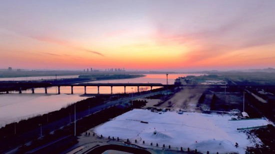 正月初五,两趟高铁列车在滹沱河上交会。