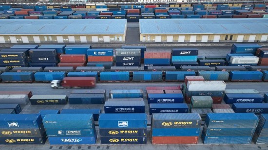 石家庄国际陆港的中欧班列装车待发。