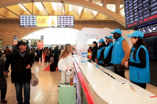 1月14日春运首日,外籍留学生志愿者走进石家庄站为旅客服务。