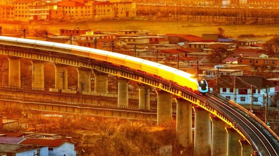 1月28日除夕,一列复兴号动车组迎着朝阳行驶在京广高铁上。