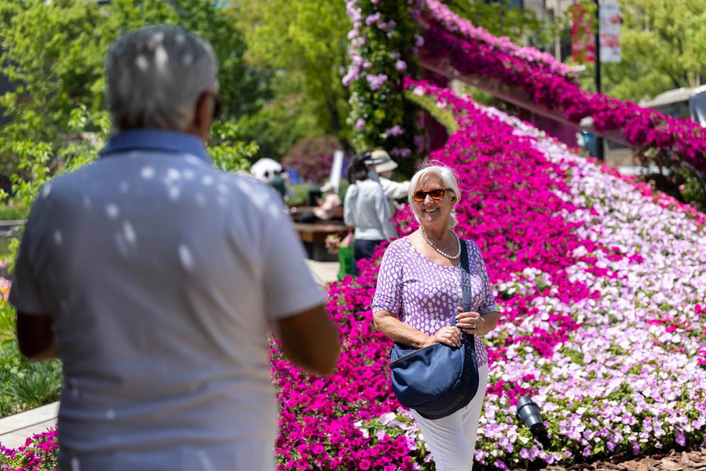 4月18日,外国游客在上海国际花展黄浦新天地主会场留影。新华社记者王翔 摄