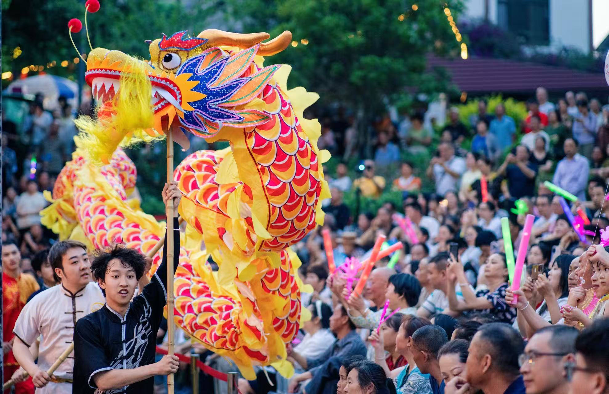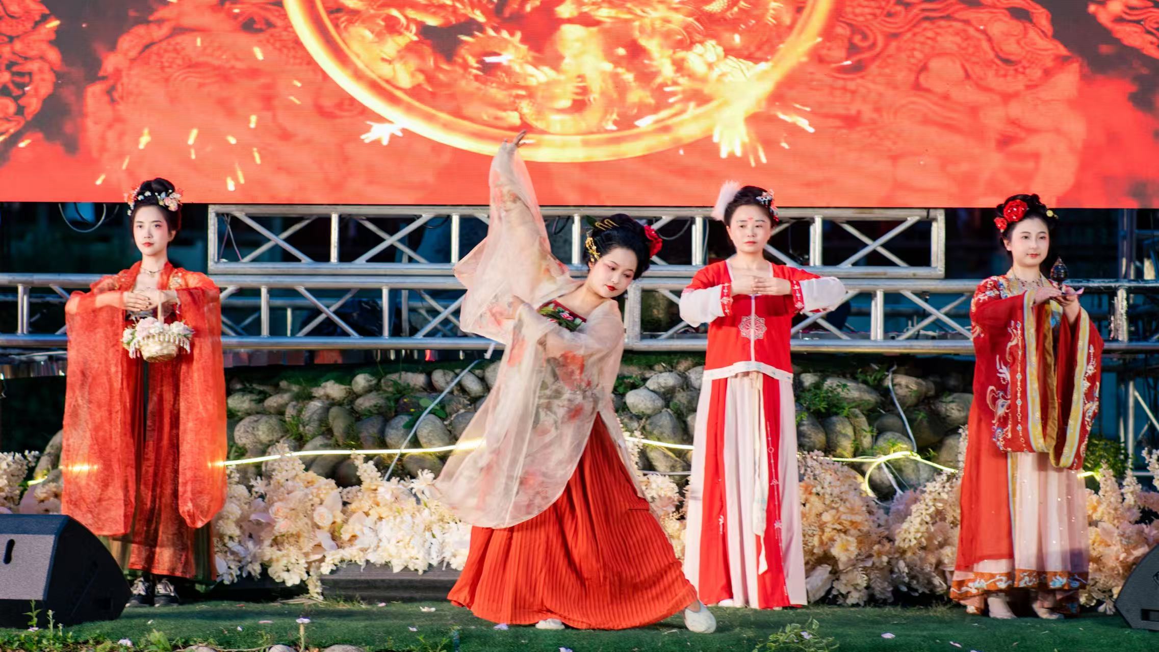 值得一提的是,活动在互动体验上大胆创新。亲子茶艺《奉茶传孝》以茶为媒,传递孝悌家风;古风蹦迪《中国人不蹦洋迪》将电音民乐与汉服舞蹈巧妙融合,让传统文化焕发时尚活力,引得年轻观众纷纷点赞:“原来传统文化可以这么潮!”当无人机撒下的花瓣雨飘落肩头,现场欢呼声此起彼伏,灯光与笑脸交织成文化共融的生动画面。