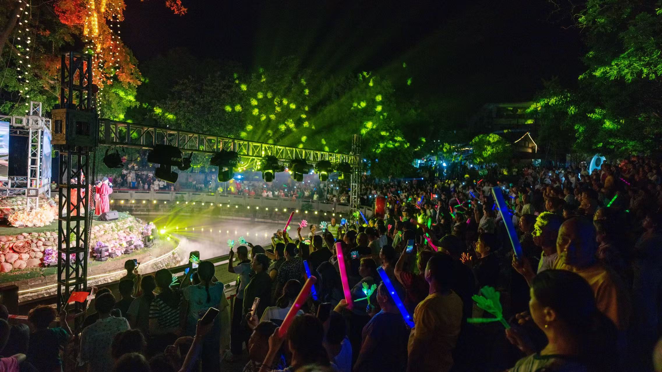 演出在《盛世华章》的全场大合唱中落幕,观众席间手机灯光如星河闪烁。作为2025孝泉古镇“芳菲孝泉”系列活动的重要一环,本次实景演艺依托邻姑泉自然景观与孝泉历史底蕴,打造“声、光、景”一体化的沉浸式夜间文旅场景,不仅提升了游客体验,更通过联动餐饮、住宿等业态,助推当地夜间经济增长,为孝泉古镇文旅融合发展注入新动力。
