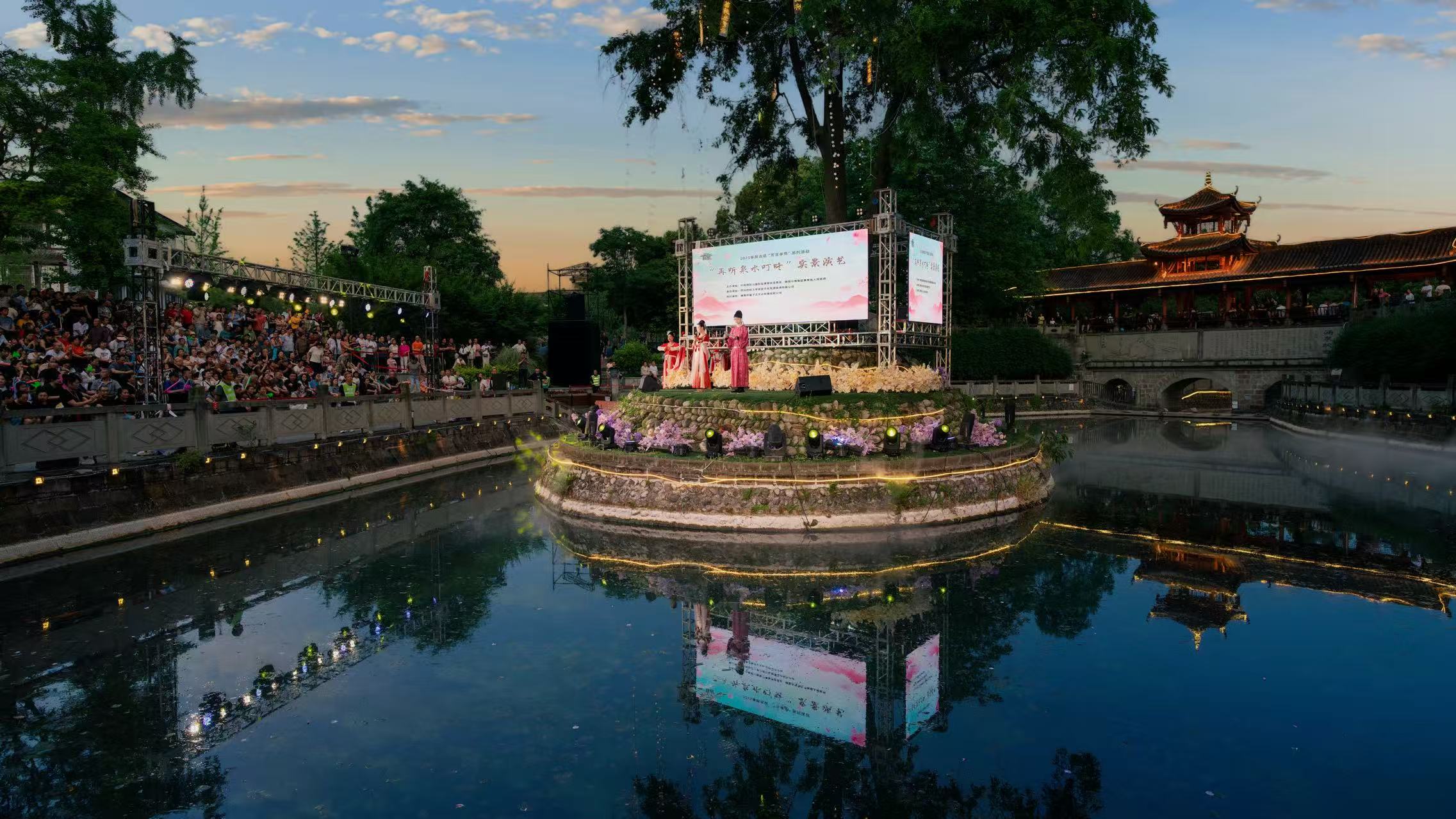 当千年孝道邂逅现代光影,一场跨越时空的文化对话在德孝之乡精彩上演。五一期间晚上,德阳市旌阳区孝泉镇邻姑泉水利风景区华灯初上,“再听泉水叮咚”实景演艺活动在此举行,用多元艺术形式激活传统文化生命力,为游客带来一场集视听盛宴与文化体验于一体的夜游新体验。
